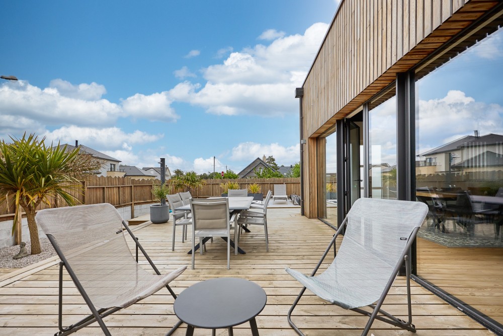 • Terrasse de 80m2 avec table et chaises, 4 transats, 2 chaises longues et douche solaire