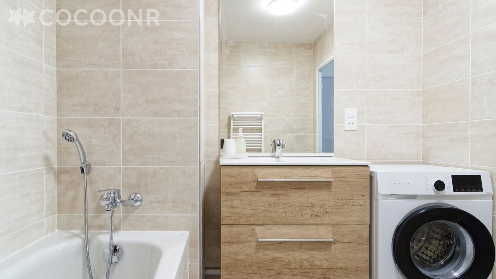 • Une salle de bain avec baignoire et lave-linge