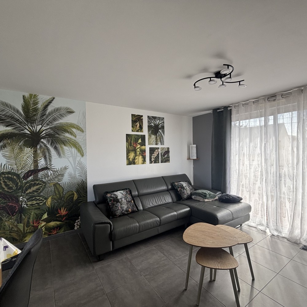 Une pièce de vie lumineuse de 32 m² avec un canapé-lit de type BZ (2 personnes), fauteuils, table basse, TV