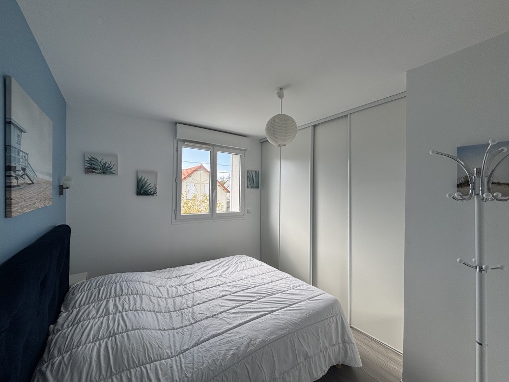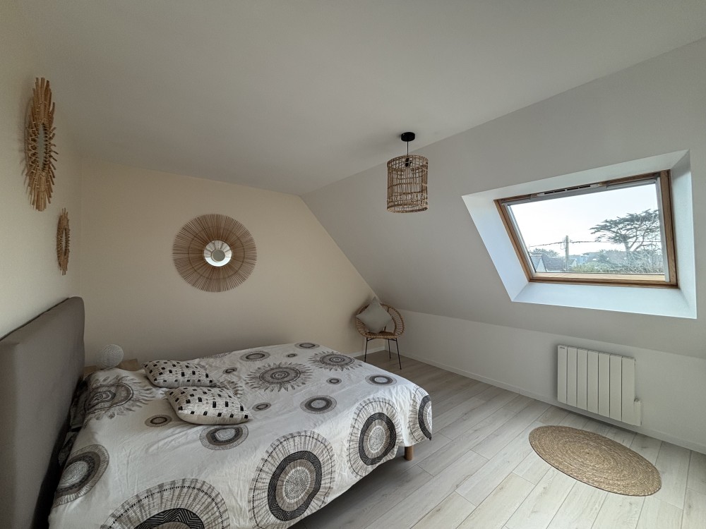 Chambre 1 : pièce de 14 m² avec vue mer, un lit queen-size (160×200) et un grand dressing